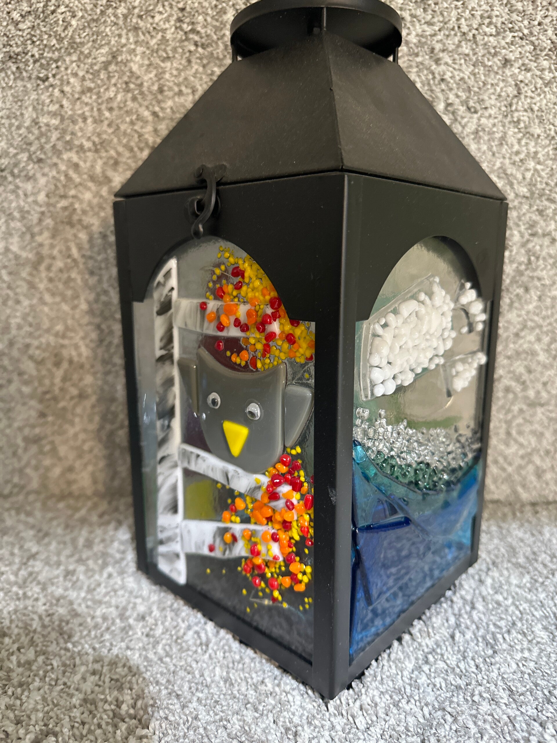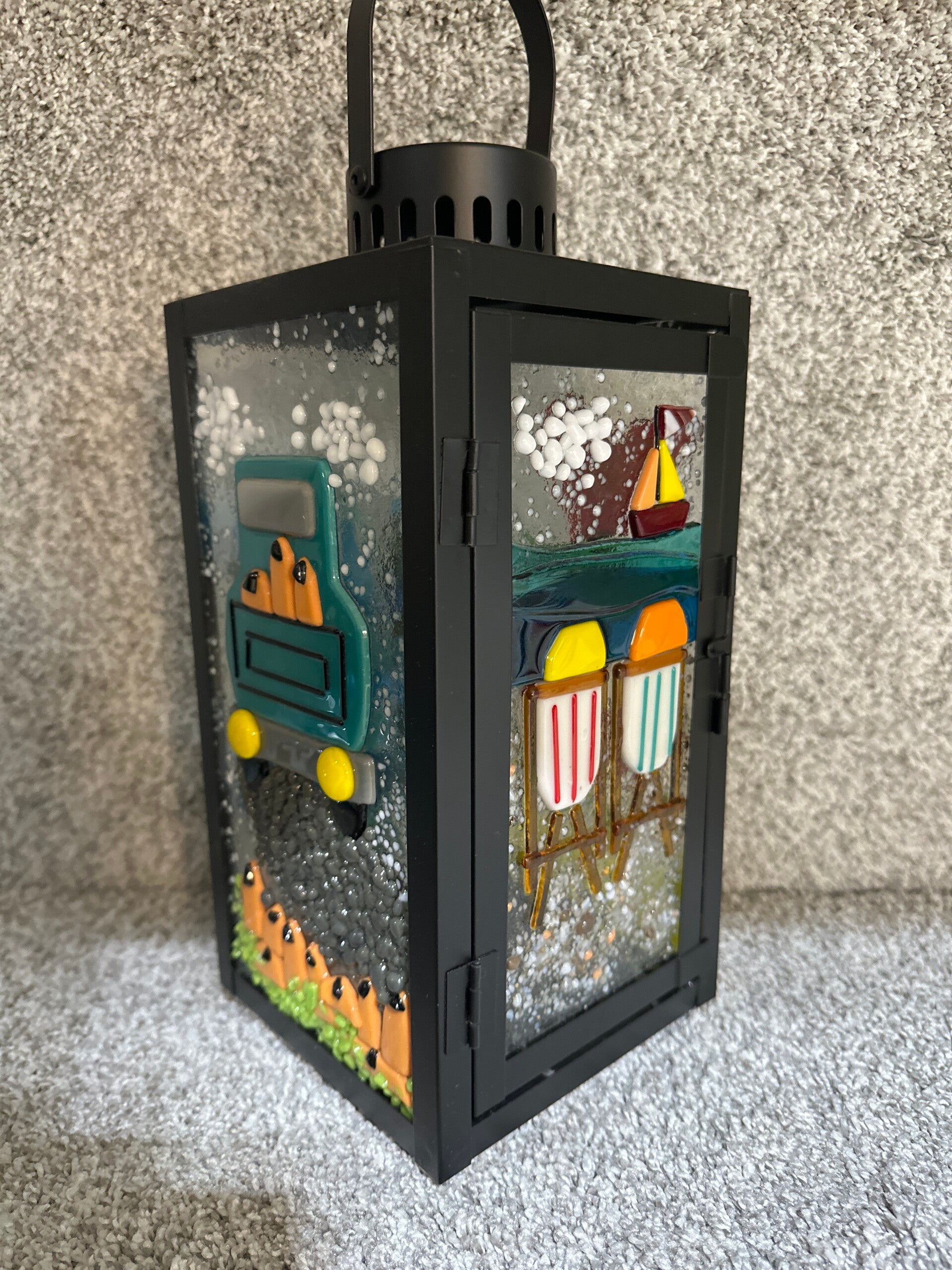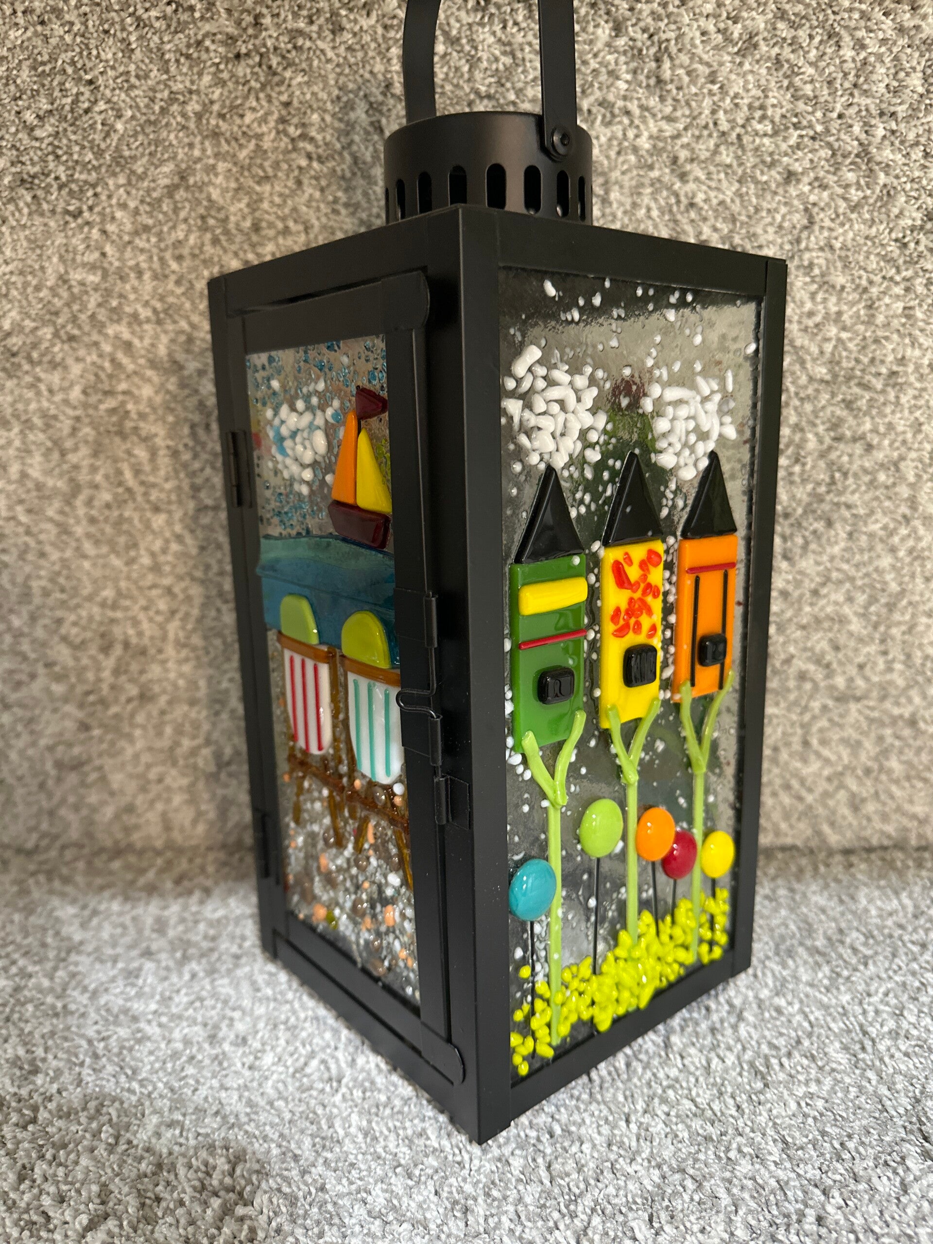 Metal Lantern with various summer fused glass panels.