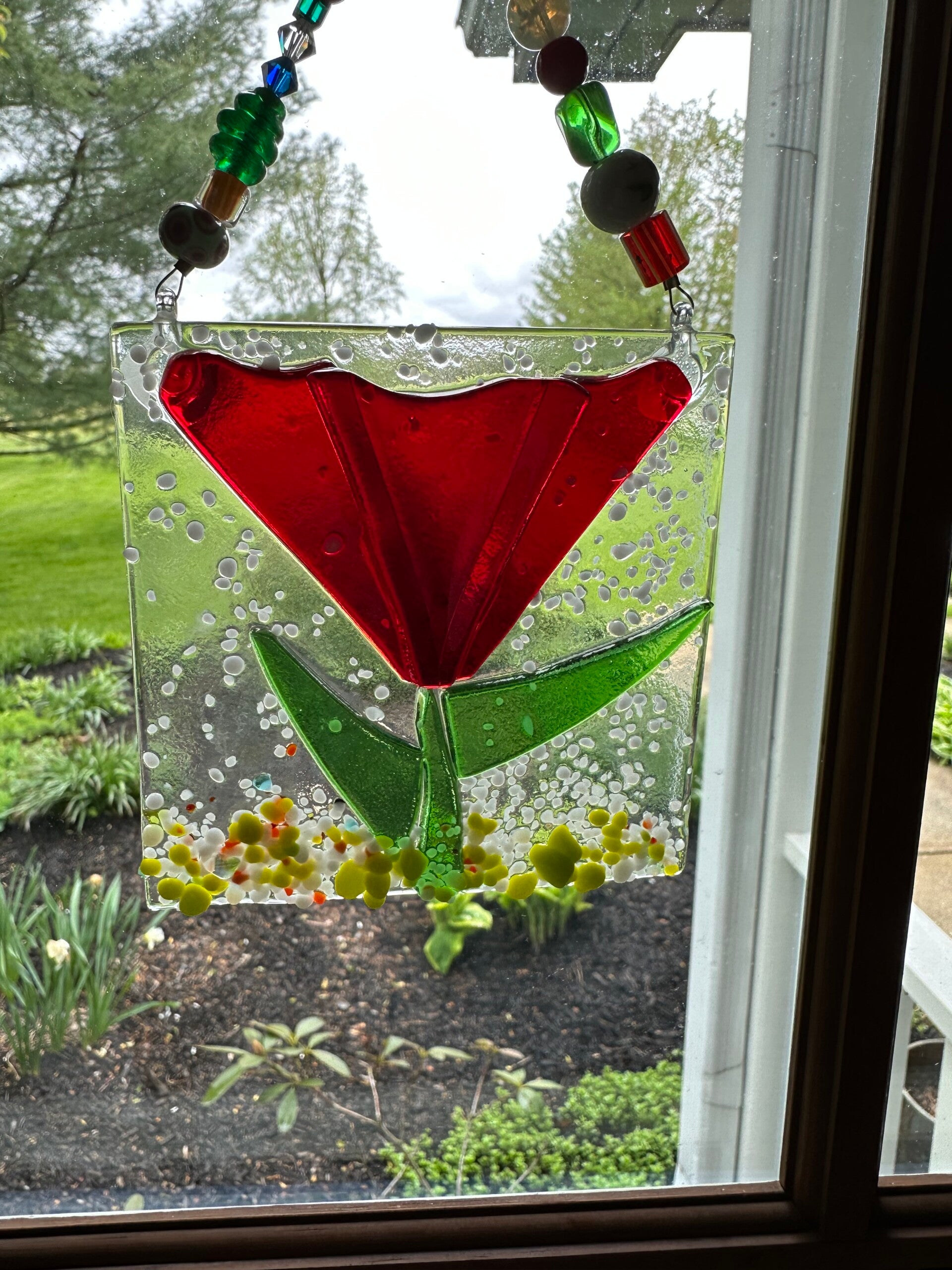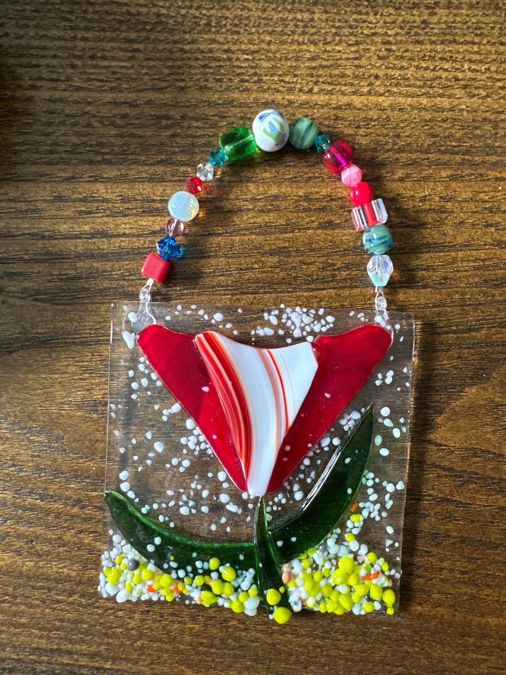 this suncatcher appears red when in the window, but is actually partially red and white. See pictures.