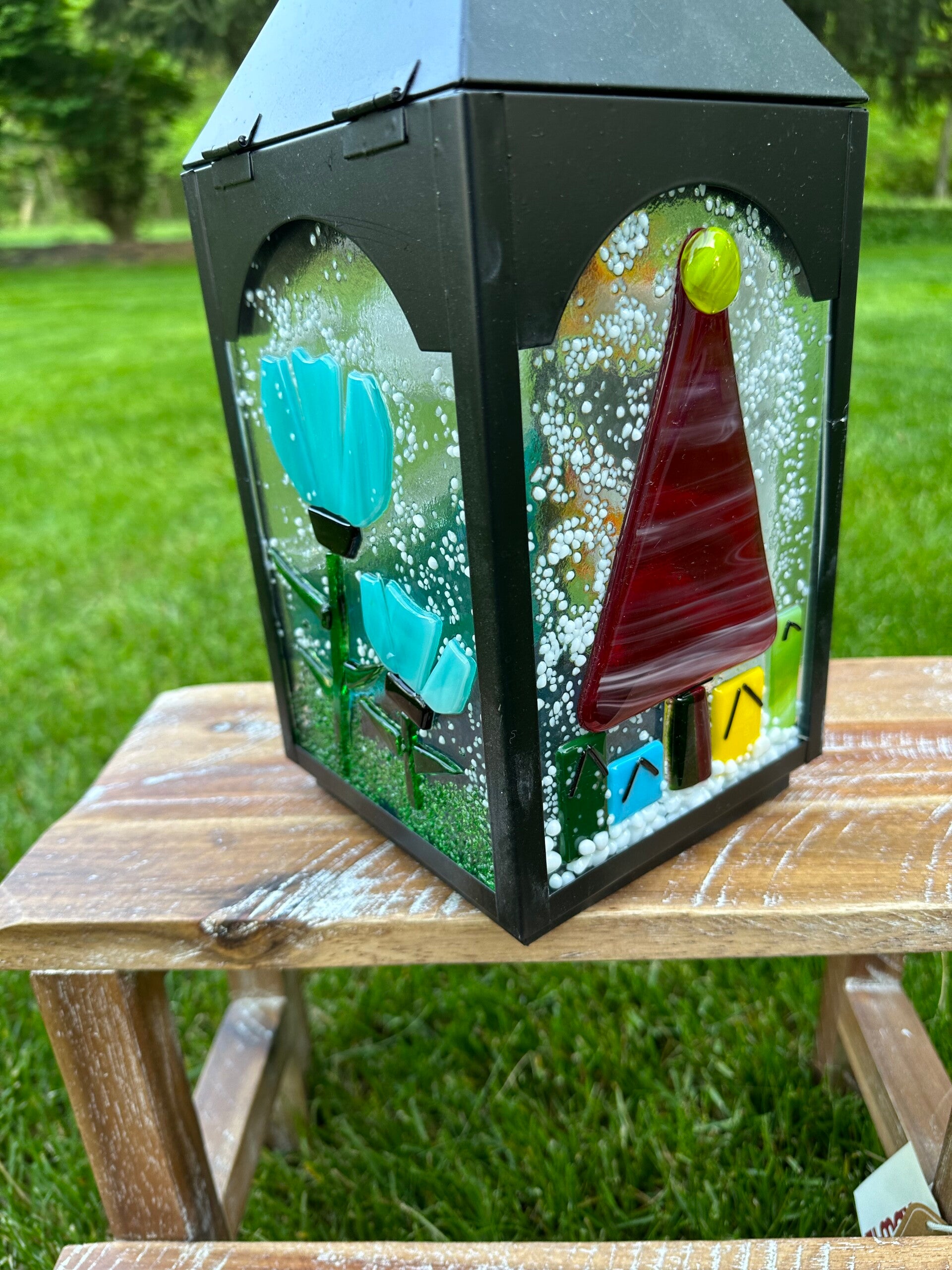 Black Metal Lantern with various four season fused glass panels.