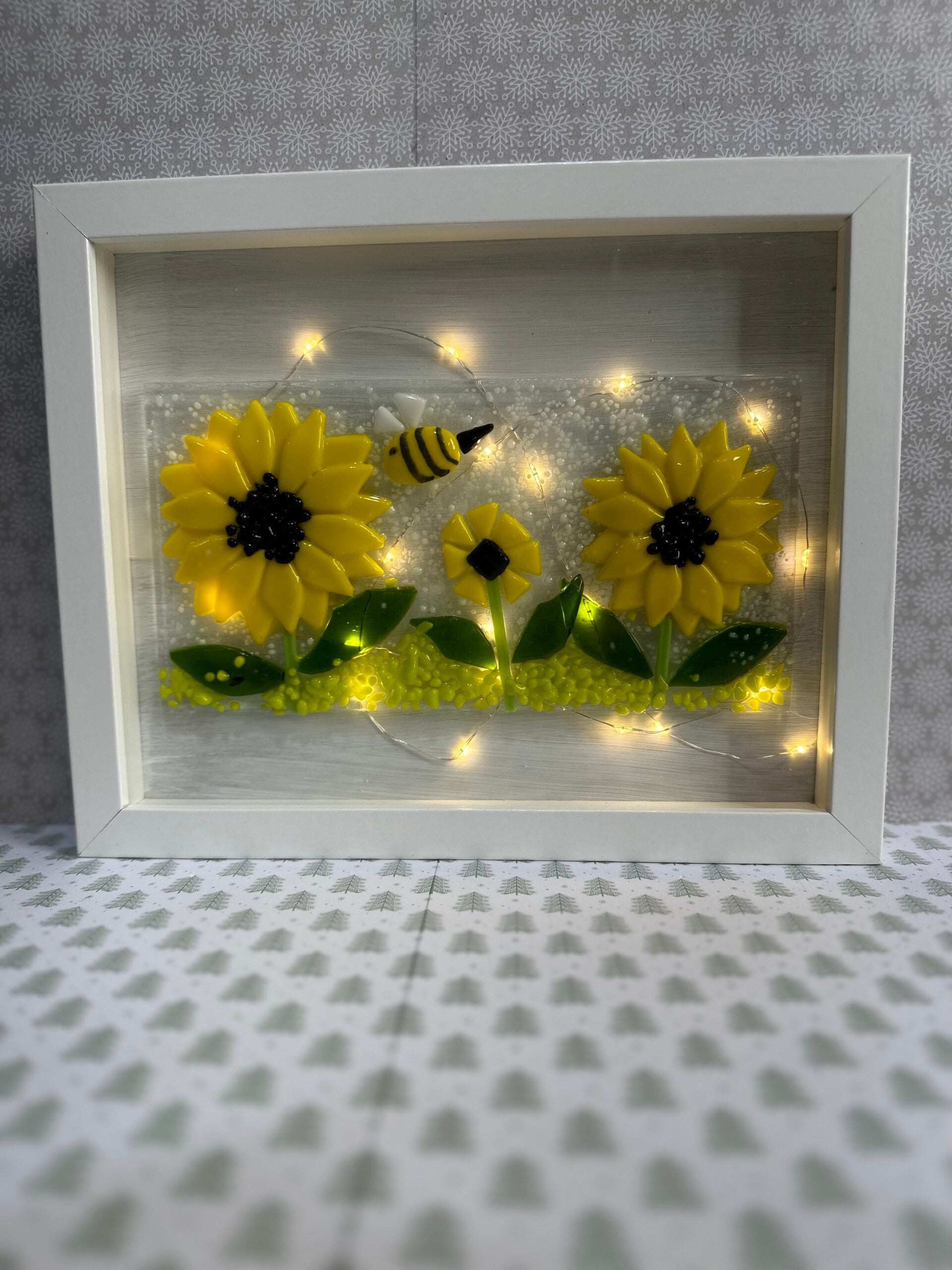 Fused glass Sunflower Scene and framed in a shadow box with battery operated fairy lights.