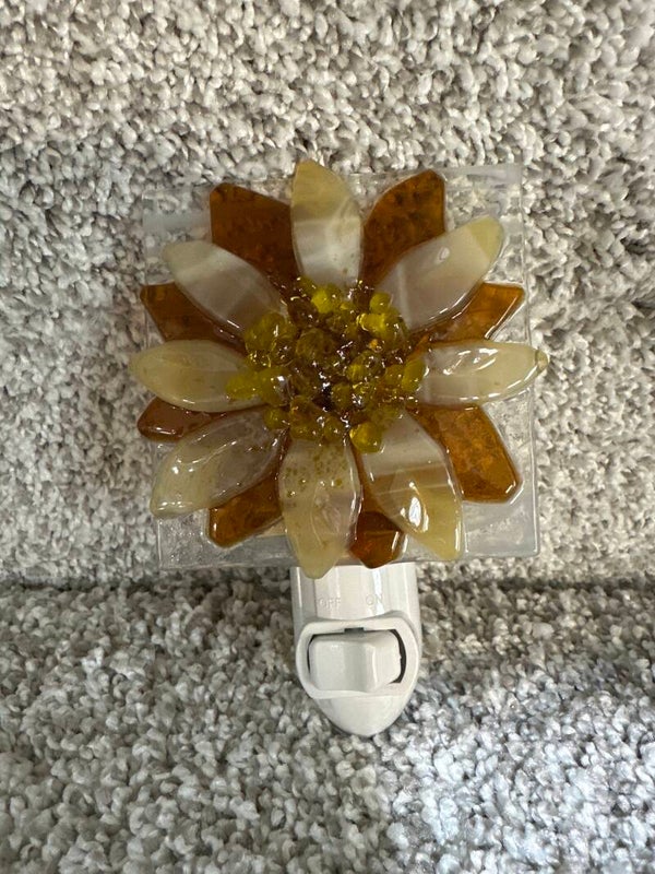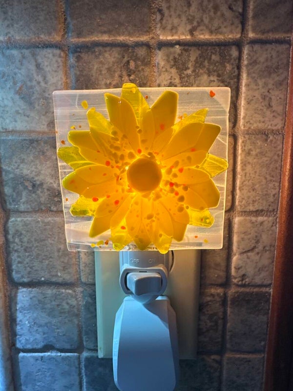 The glass design is hand cut, arranged on a 3”x3” piece of glass and then fused in my kiln for 8 hours to create this adorable night light.