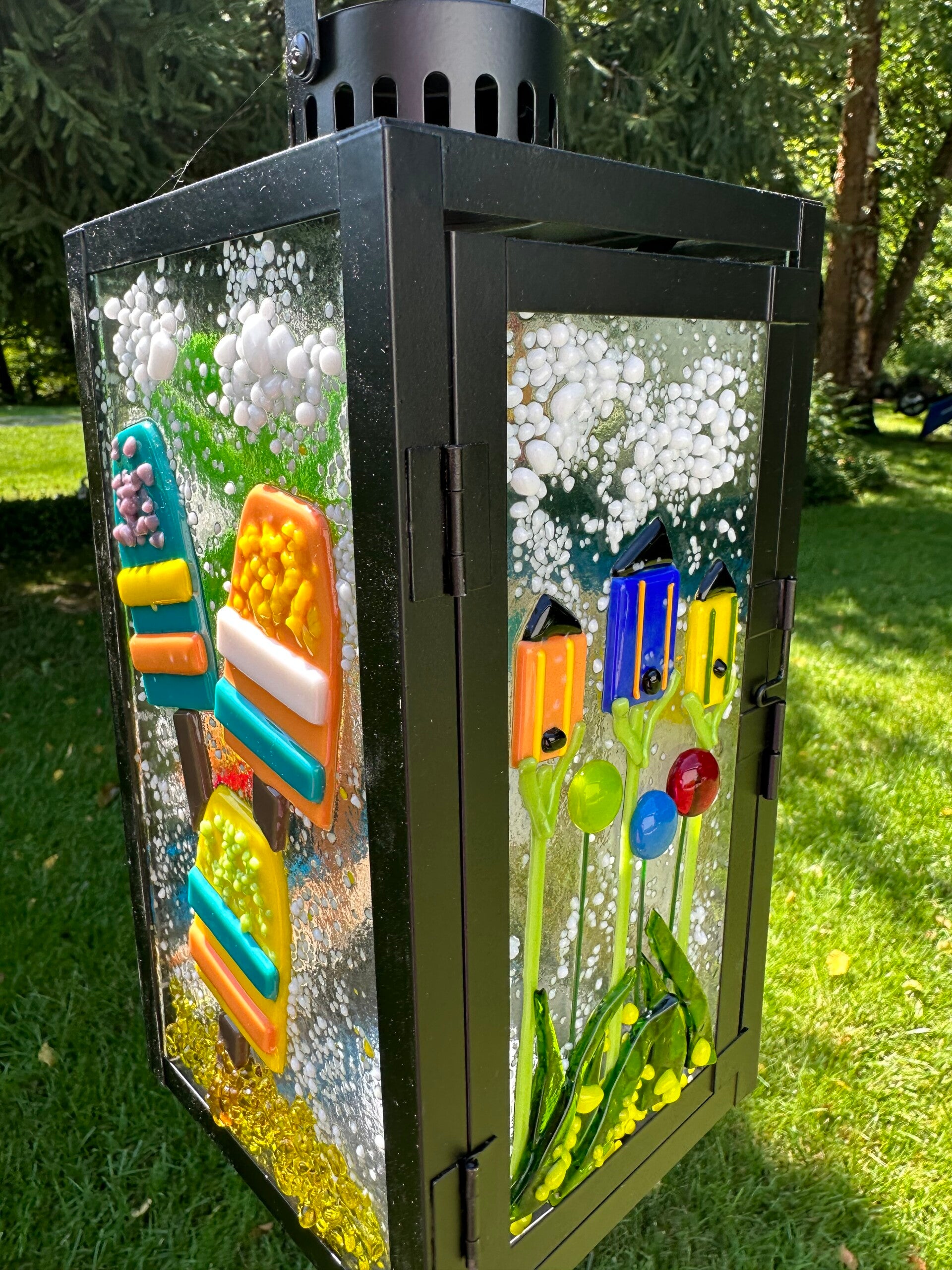 Black Metal Lantern with various summer fused glass panels.