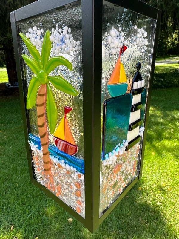 Black Metal Lantern with various summer fused glass panels.