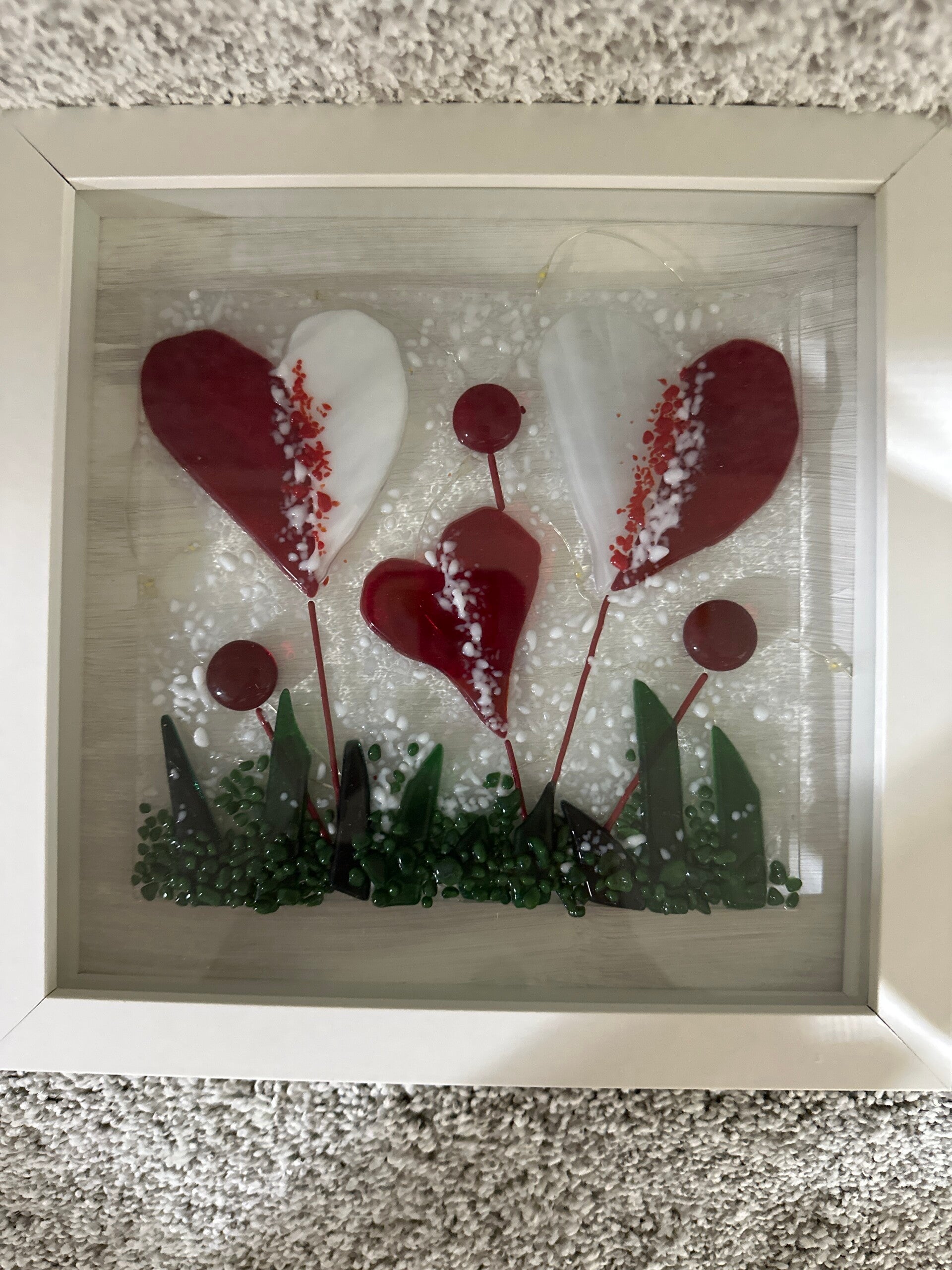 Fused glass Heart Scene and framed in a shadow box with battery operated fairy lights.