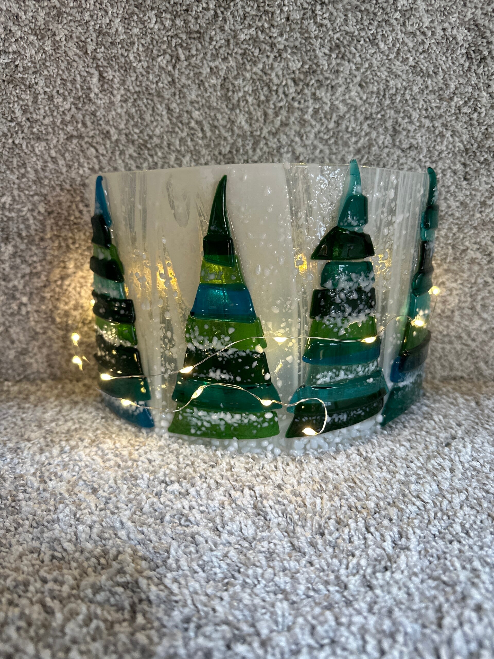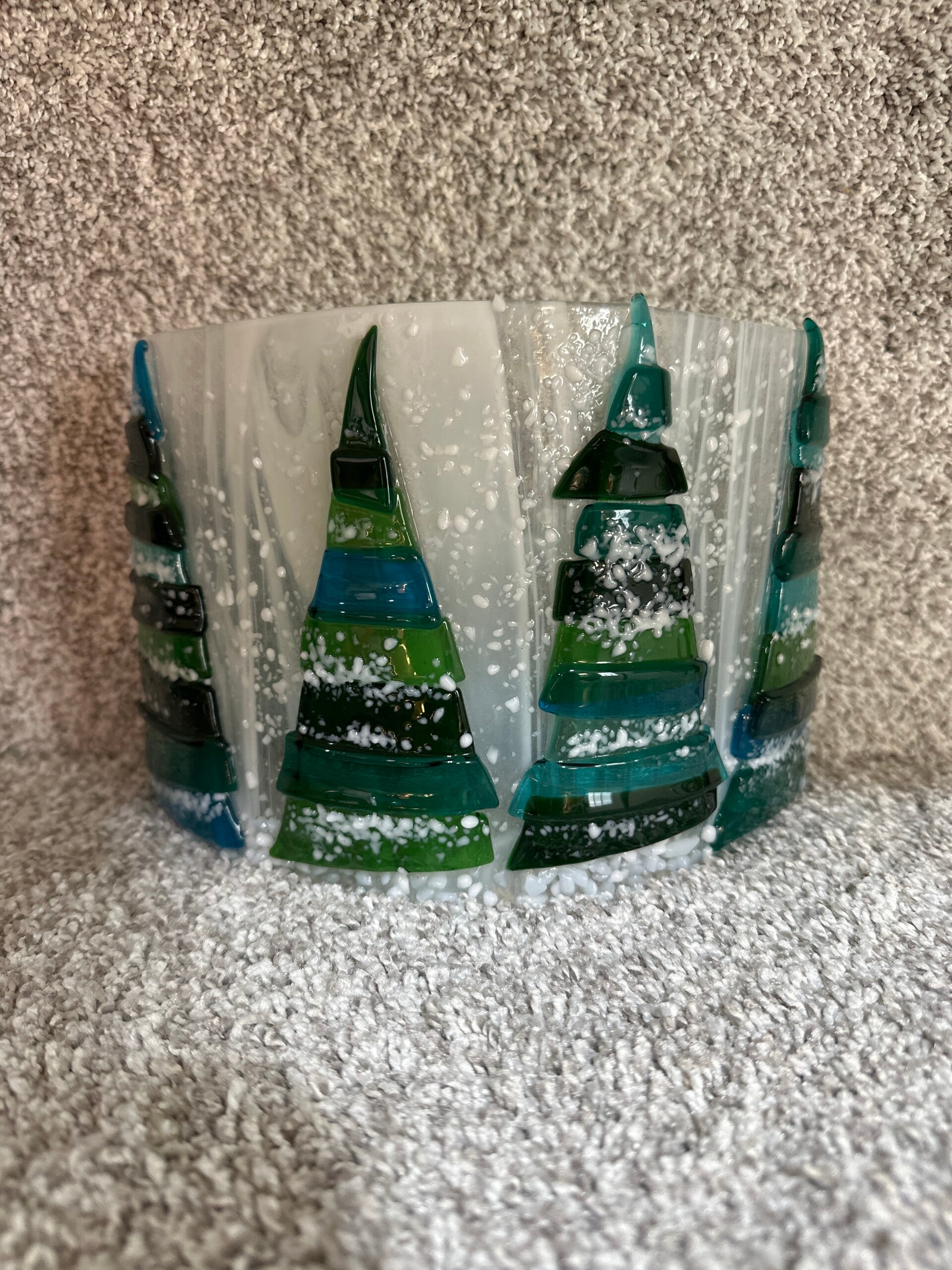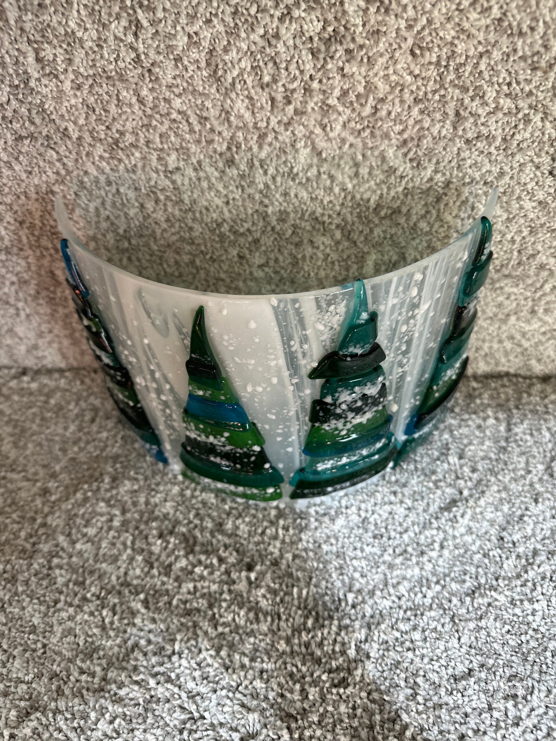 Add a touch of festive charm to your home with this curved fused glass tree panel. Perfect for Christmas decorations!