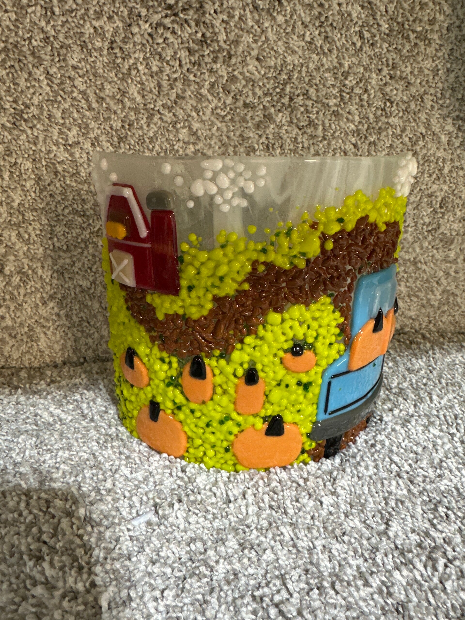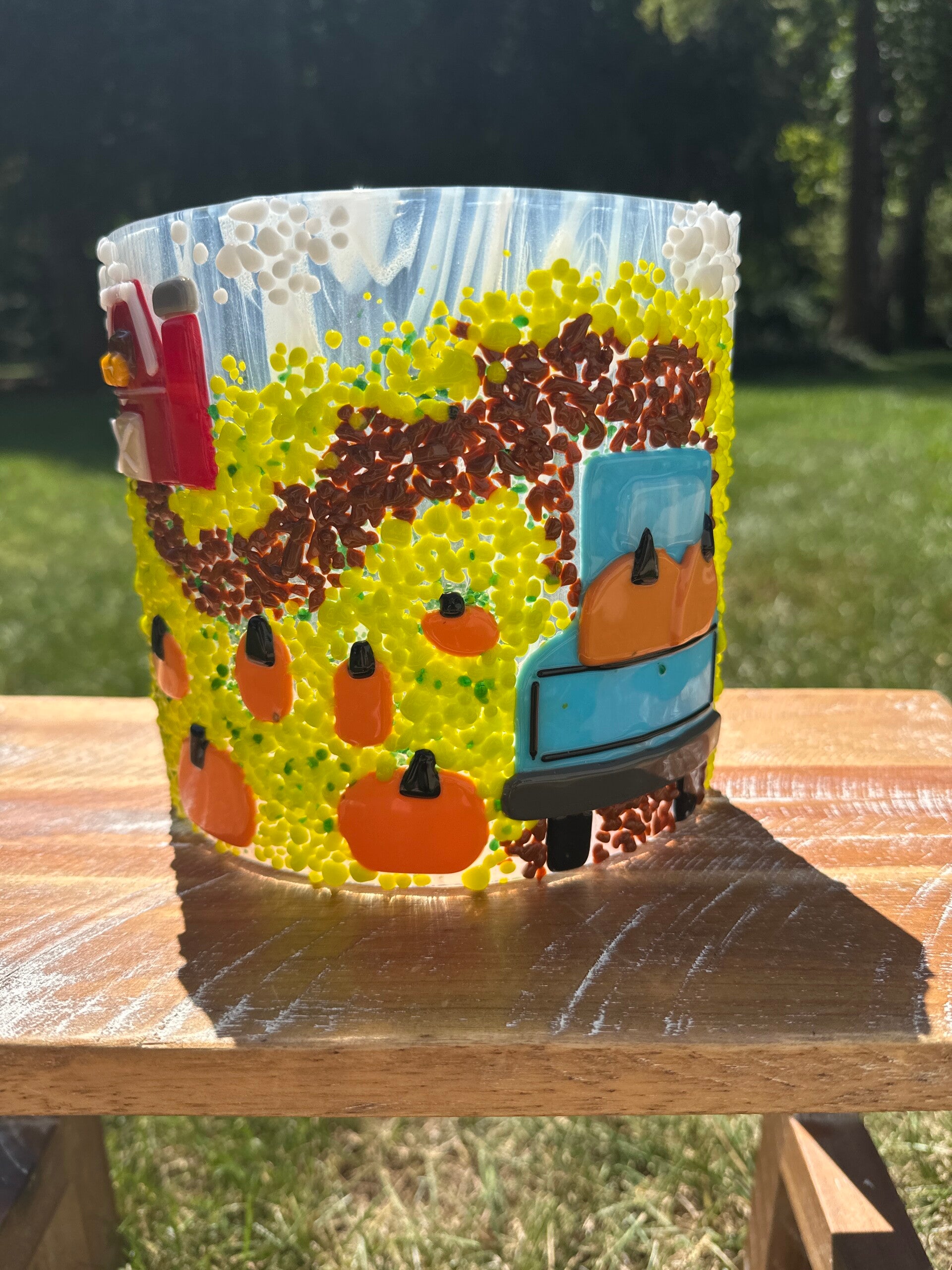 This 6" pumpkin farm panel features a charming fall scene with a blue truck surrounded by pumpkins, perfect for your fall seasonal décor.