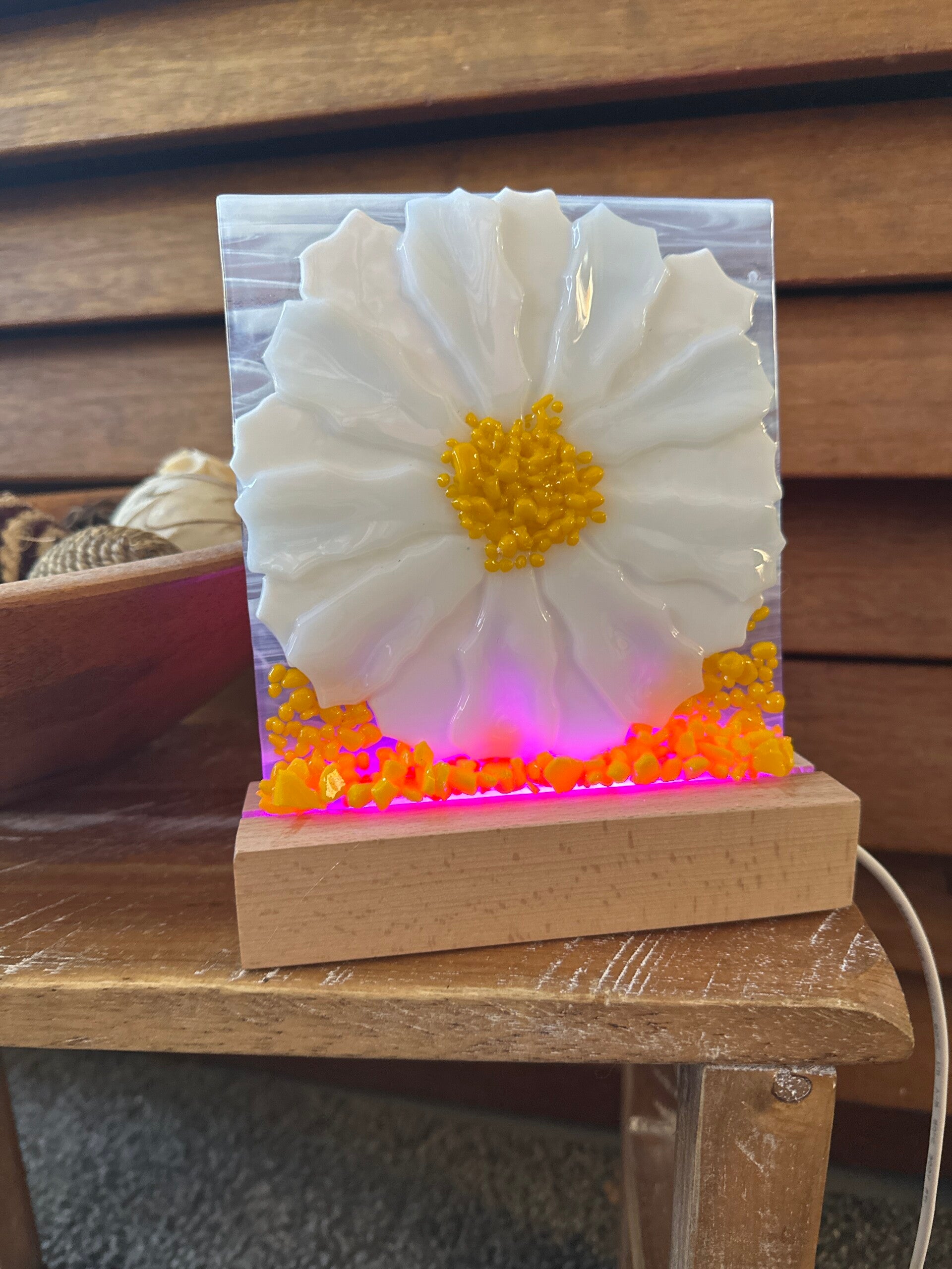 The first seven pictures of the white flower show the different colors of the LED display light.