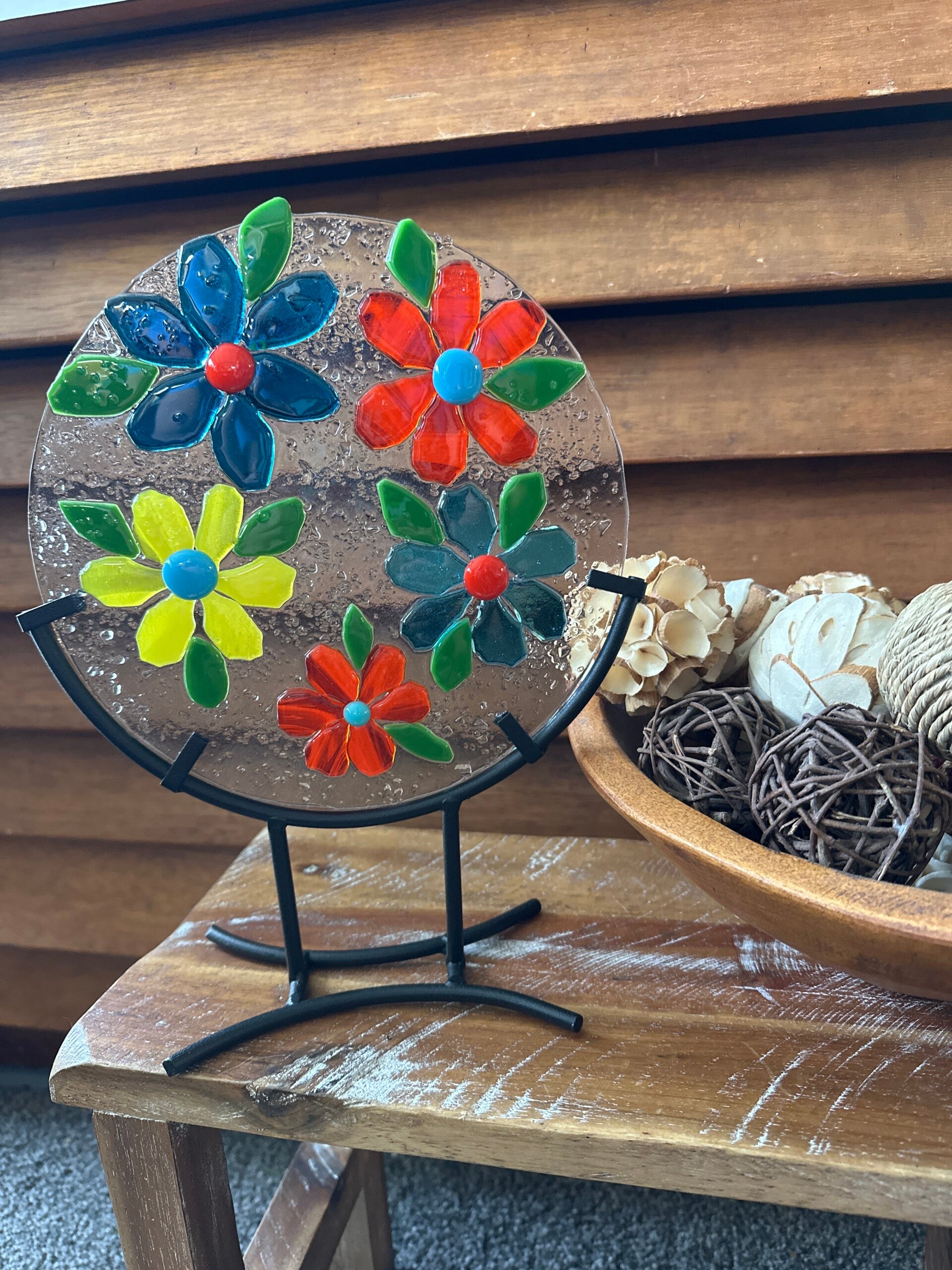 Transform your space with this adorable 8" multi-colored flower panel on an iron stand. The vibrant colors and intricate floral designs will add a touch of beauty and elegance to any room.