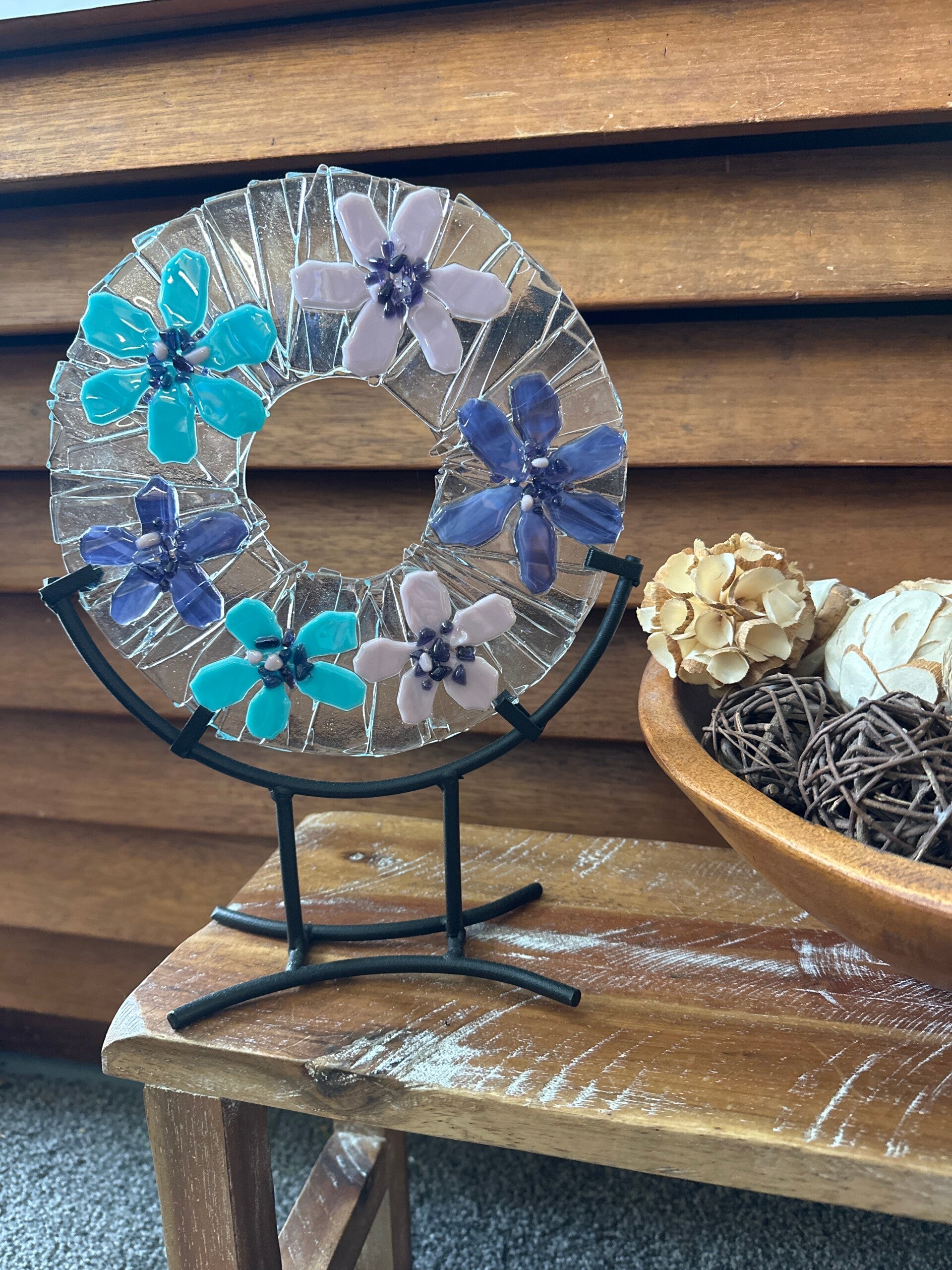 This 8-inch round flower panel features a vibrant floral design and includes a sturdy stand for easy display. Perfect for adding a touch of color and elegance to any space.