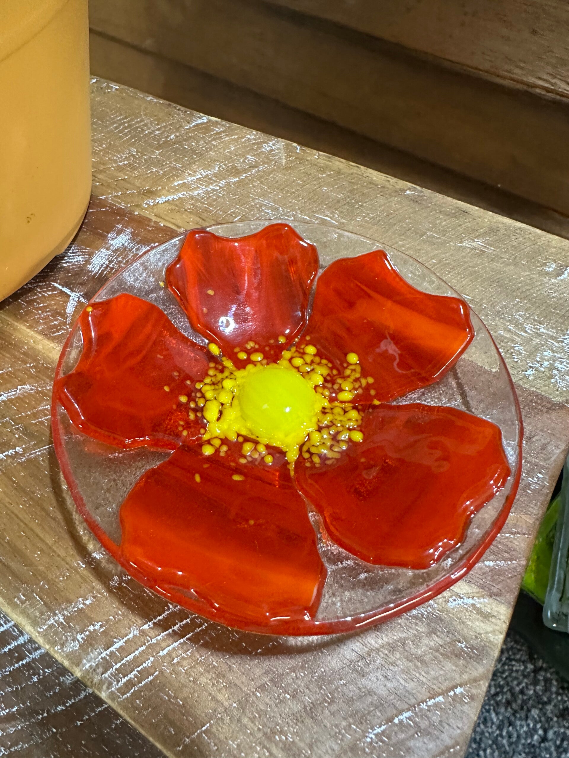 Discover the exquisite Orange Flower Bowl - a handcrafted trinket bowl featuring vibrant colors. Versatile and charming, it's perfect for keeping track of jewelry.