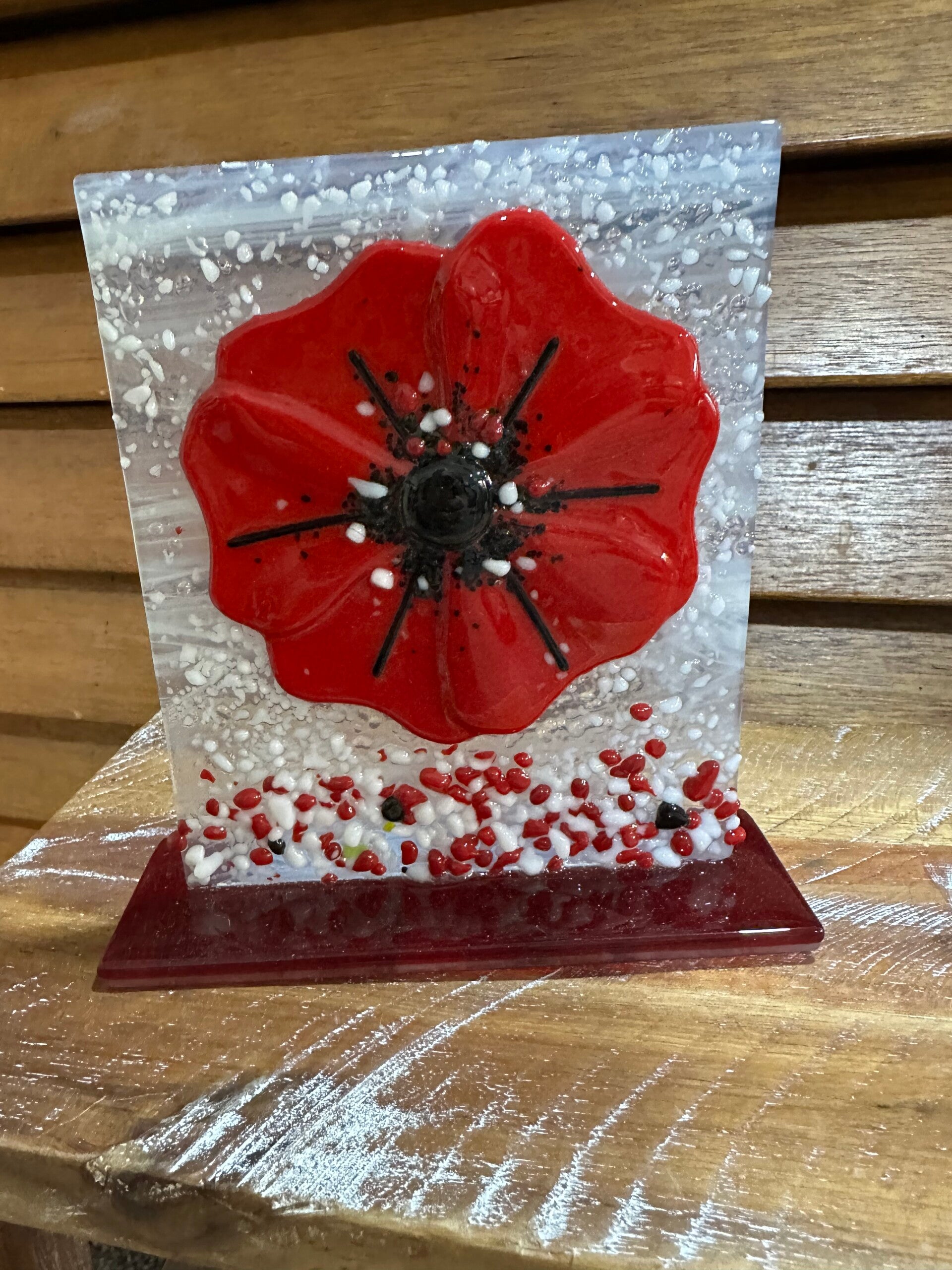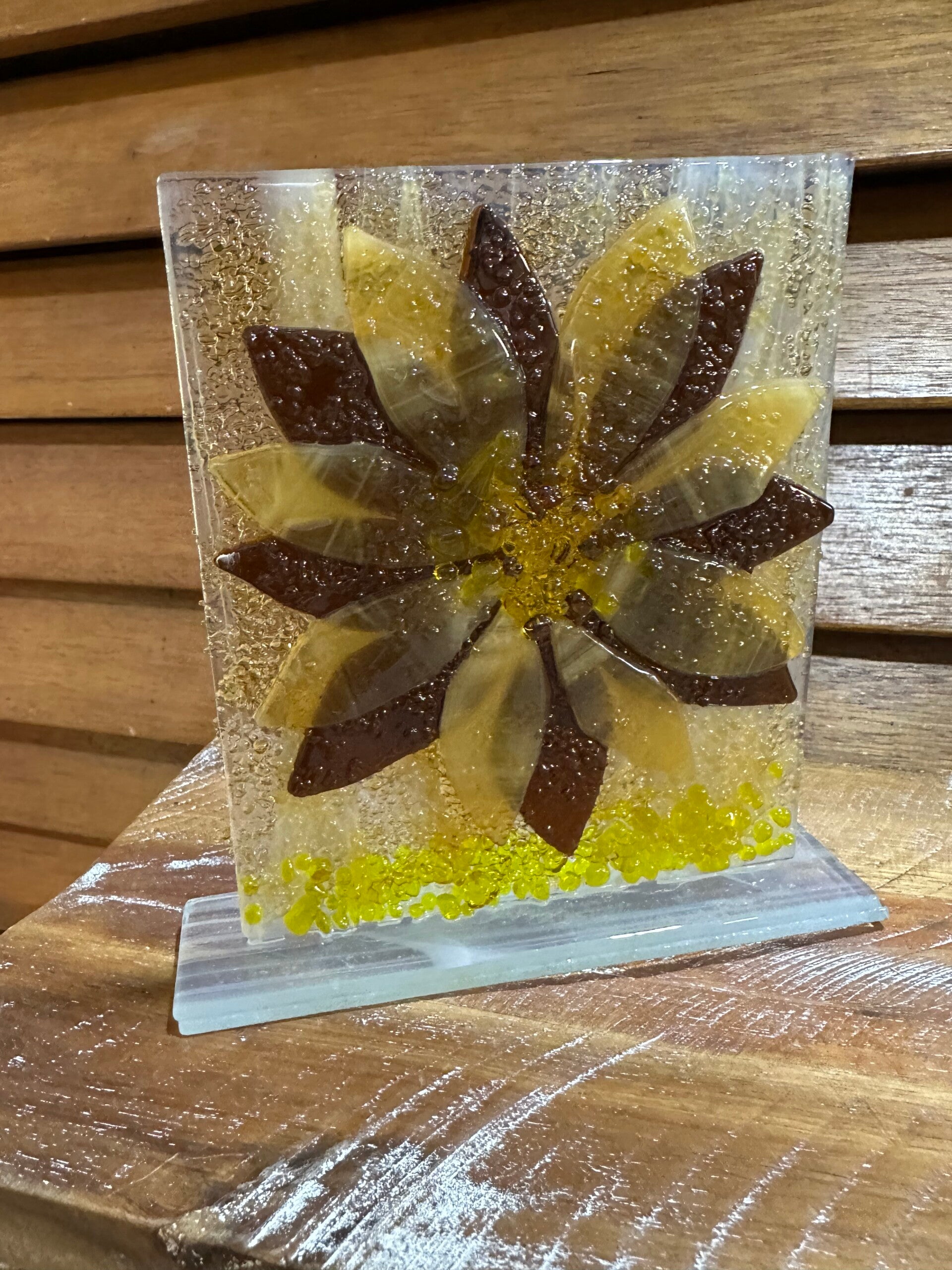 Cheers for a variety of five to 6" x 6" panels with stands. Add fairy lights Around the panelOr a flameless candle behind the panel to enhance the glass colors.