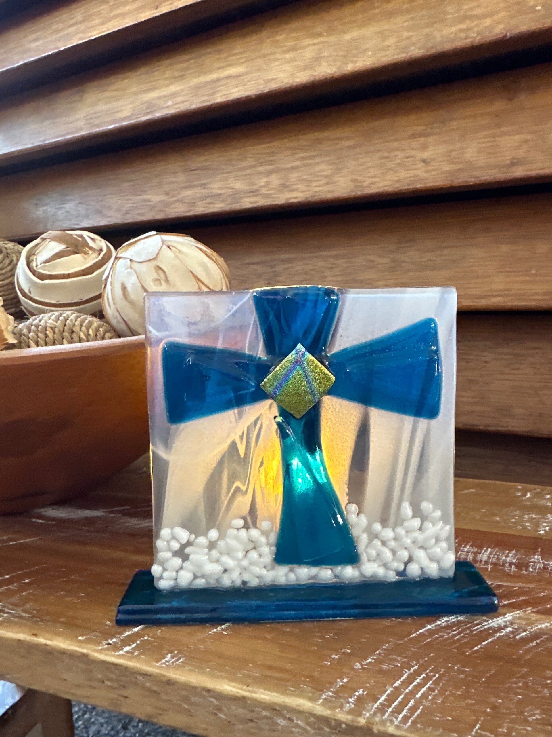 These 4" x 4" Fused glass tea lights with stand come in various designs, tea light included.