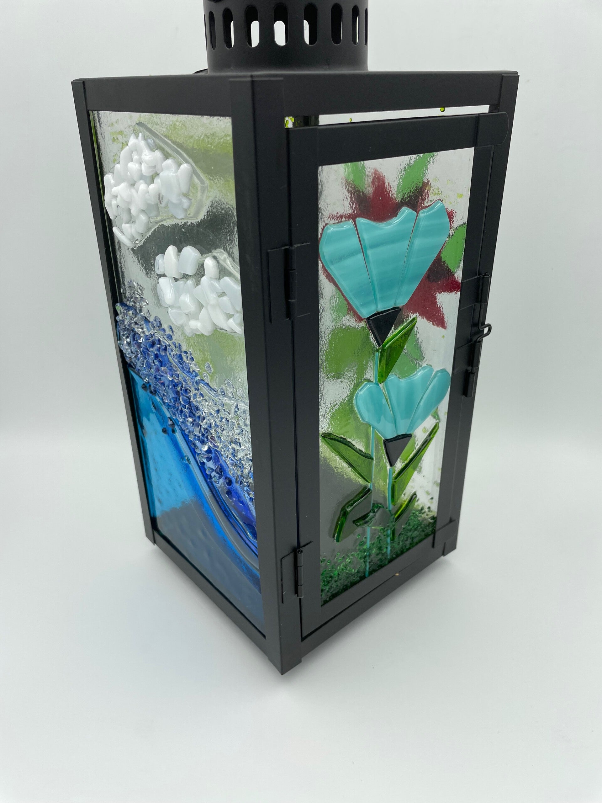 Metal lantern with fused glass panels