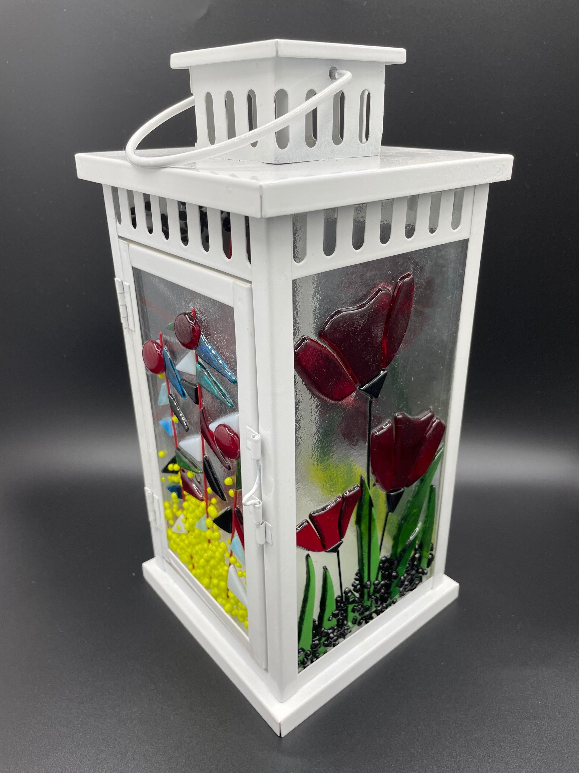 White Metal Lantern with various fused glass panels.