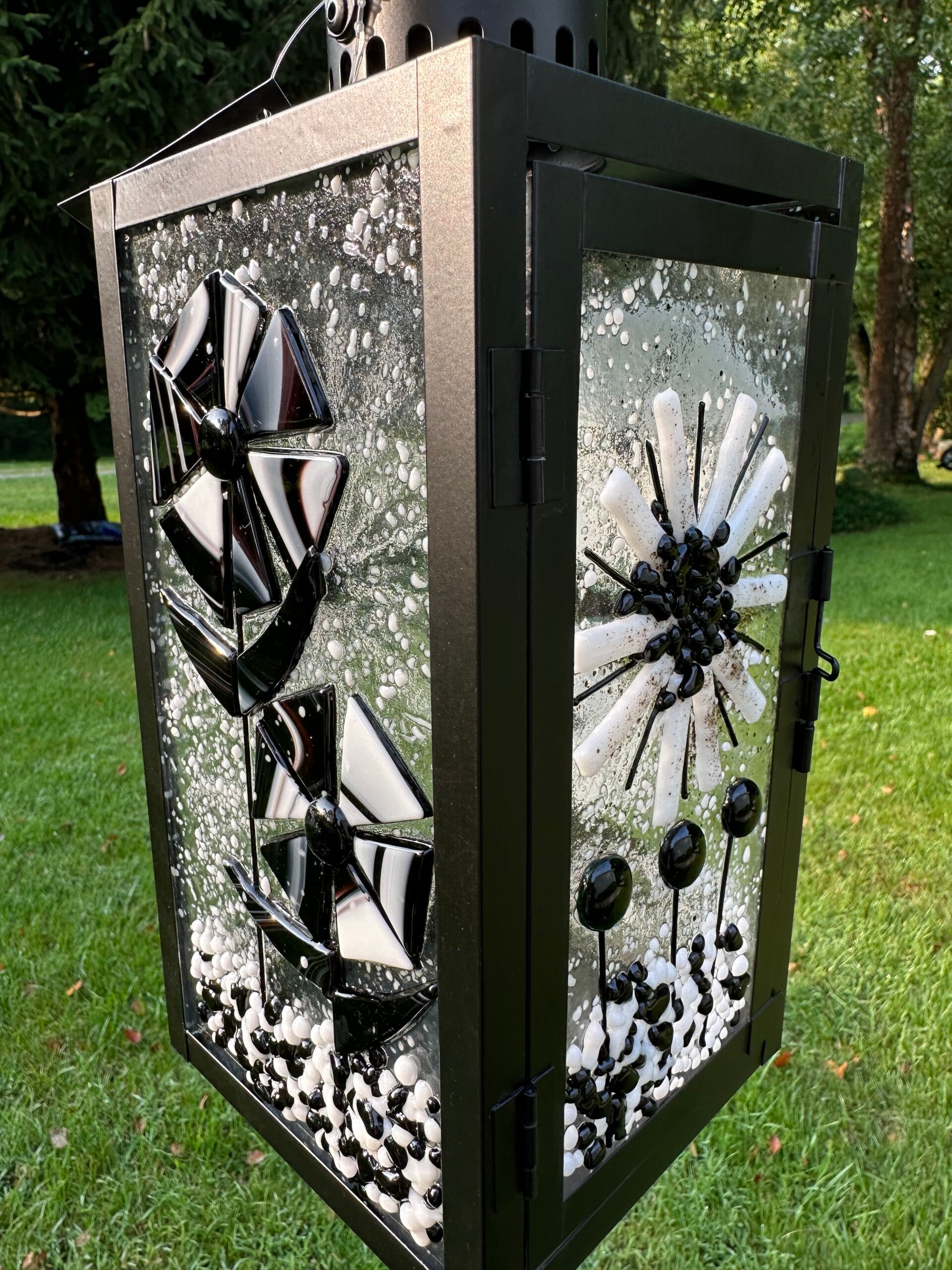 Black Metal Lantern with various black and white fused glass panels.