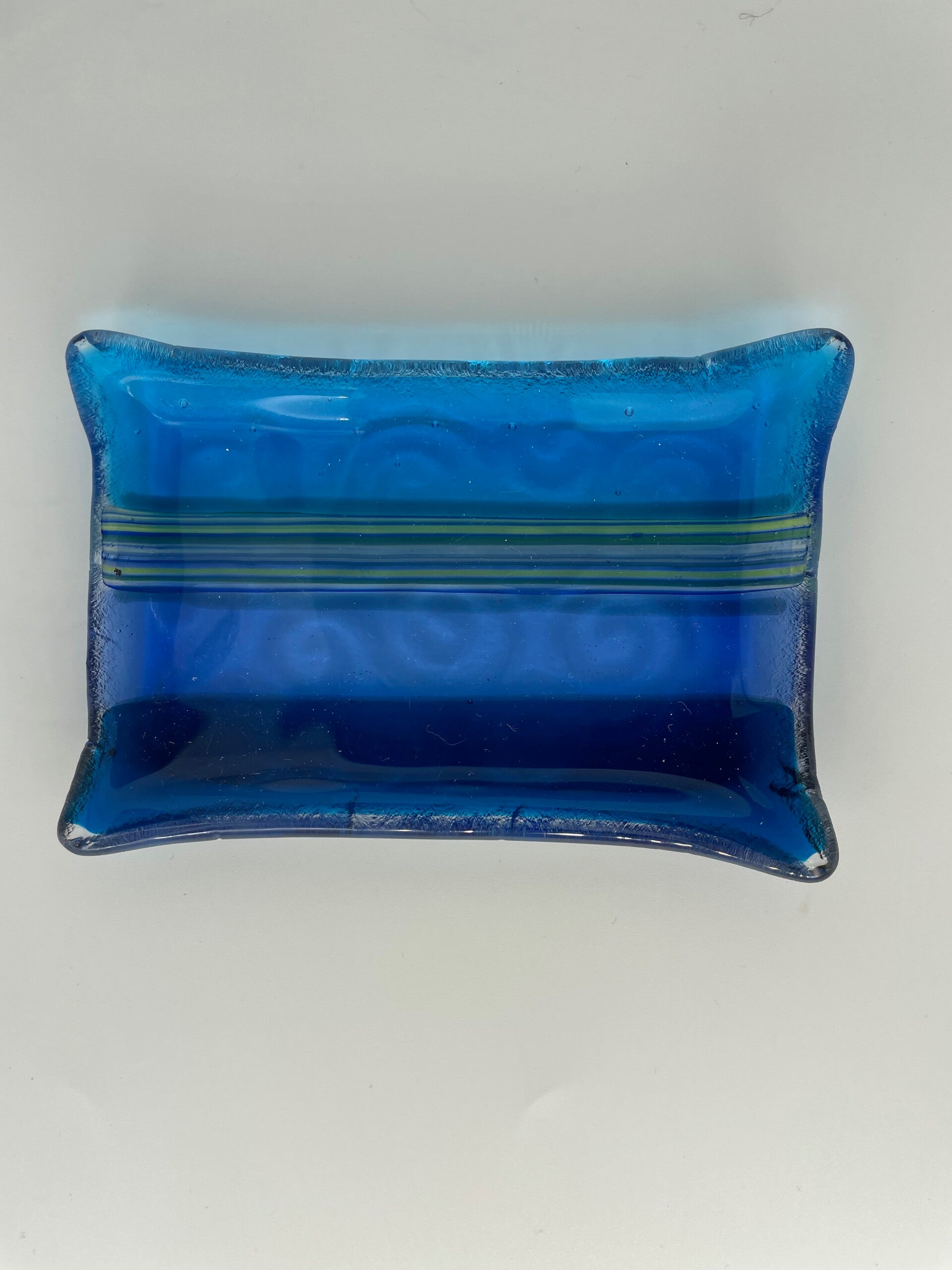 This soap dish is created by laying four different ocean colored pieces of glass on top of one clear piece of glass. The dish is fused flat in the kiln for 7 hours and then fired a second time in the kiln for 8 hours in a swirl ceramic mold to create this unique soap dish.