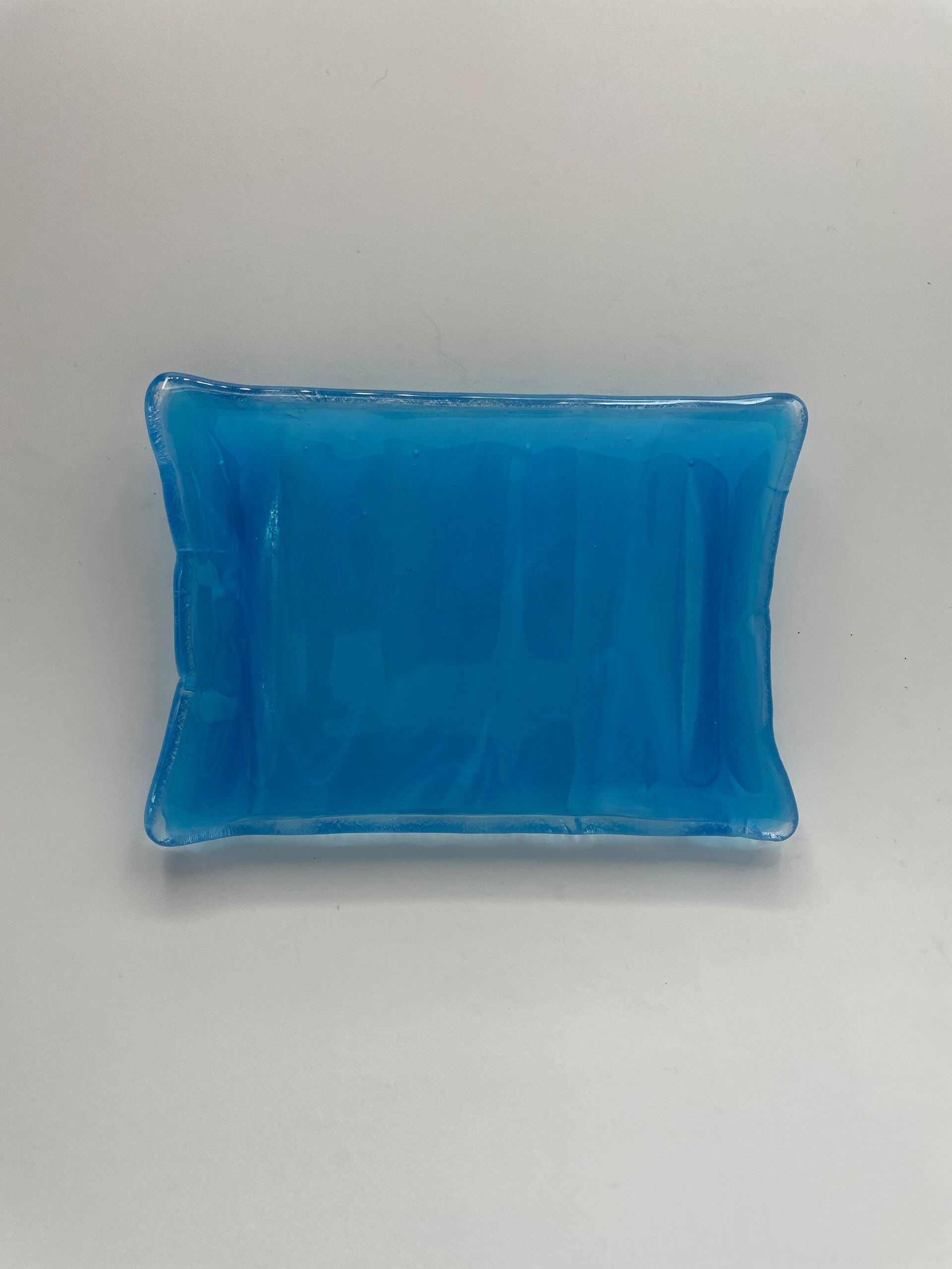This soap dish is created by layering two pieces of glass, one clear and one aqua colored glass. The glass is fused flat in the kiln for 7 hours and then fired a second time in the kiln for 8 hours in a ceramic mold to create this soap dish.