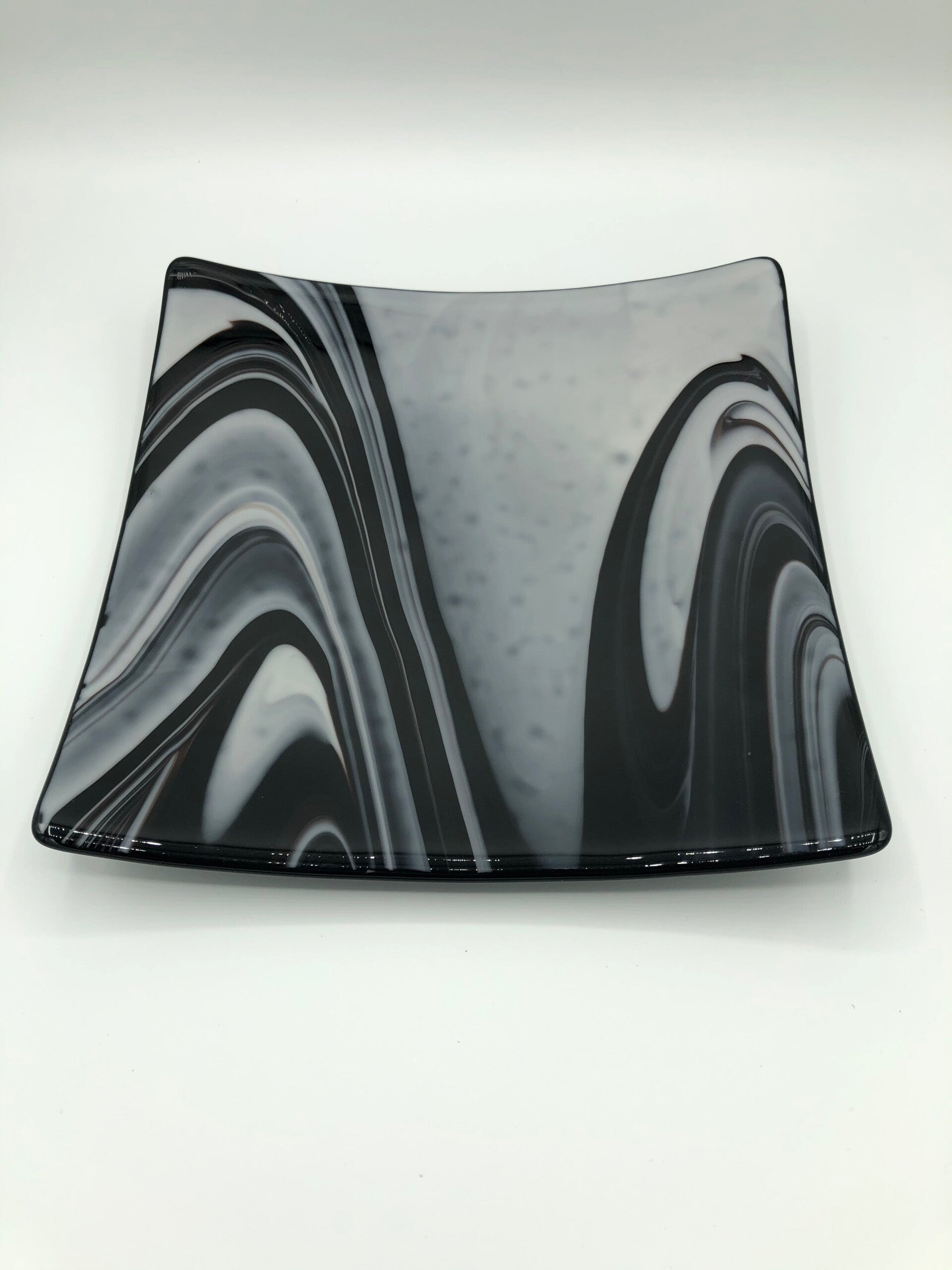 This piece was fused twice in my kiln. First firing was to get two pieces of glass, a clear piece and also the licorice piece of glass to fuse together into one piece. Then it was fired a second time in a curved mold to give it the unique shape.