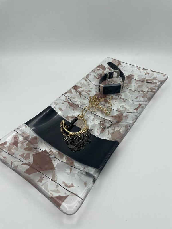 This rectangular platter in mauve, white, and clear chips is great for the kitchen when serving snacks such as cheese and crackers. The platter can also be used in your bedroom or bathroom to hold your jewelry. A piece of black glass was cut and put in between two pieces of Mardi Grass glass to give this piece a unique look. This piece was fired twice in my kiln. First at a full fuse to get all the glass pieces to fuse together and then fired a second time in a mold to give it the platter shape.
