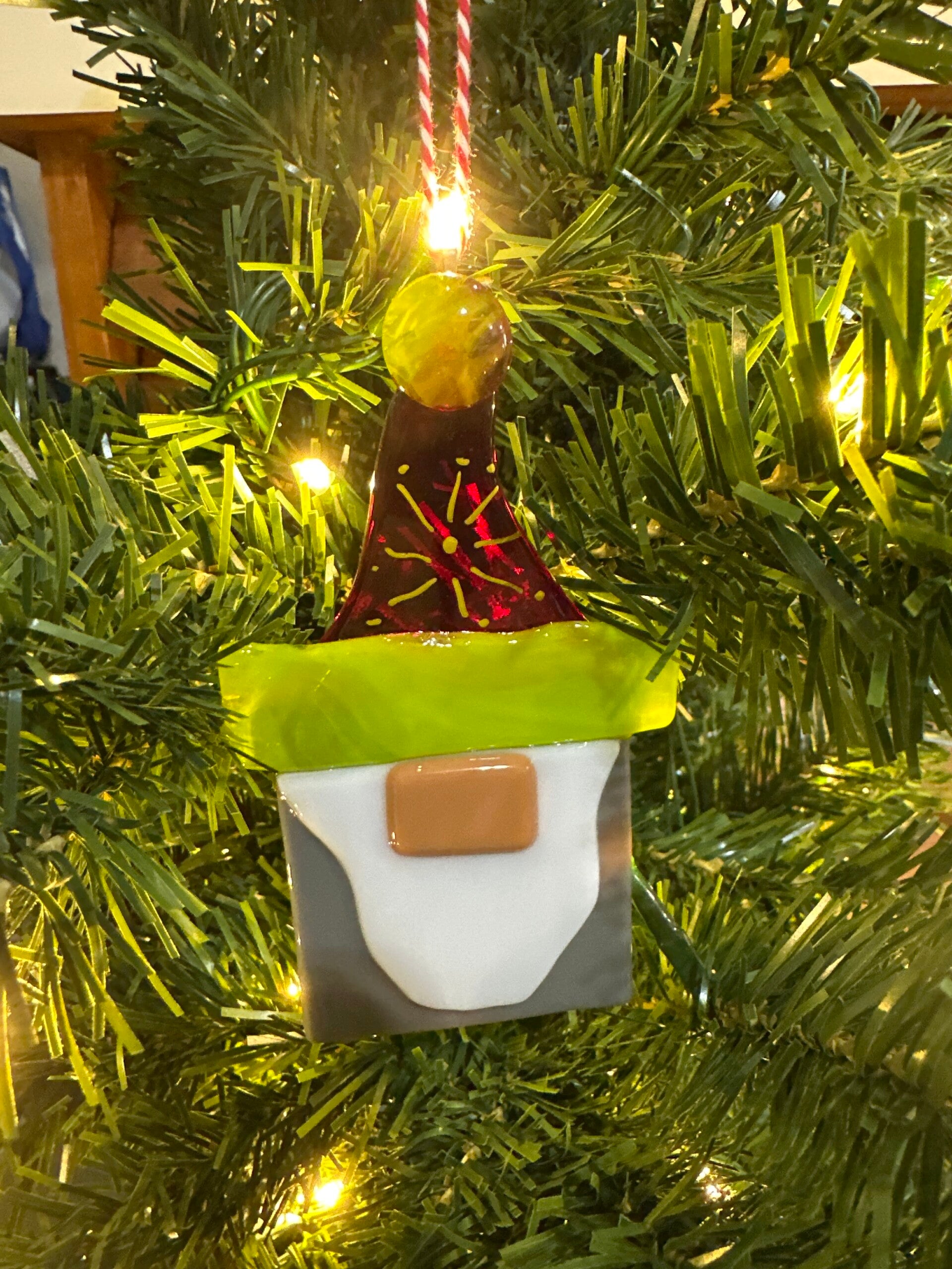 Handmade fused glass Gnome Christmas Ornament. The hat Pom Pom and trim colors vary slightly due to glass availability.