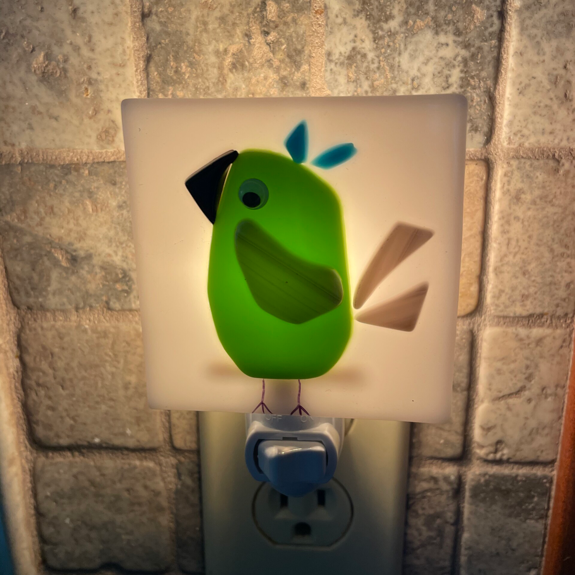 Funny Bird fused glass nightlight that provides a dim light during the night in your kitchen, bathroom, or hallway.