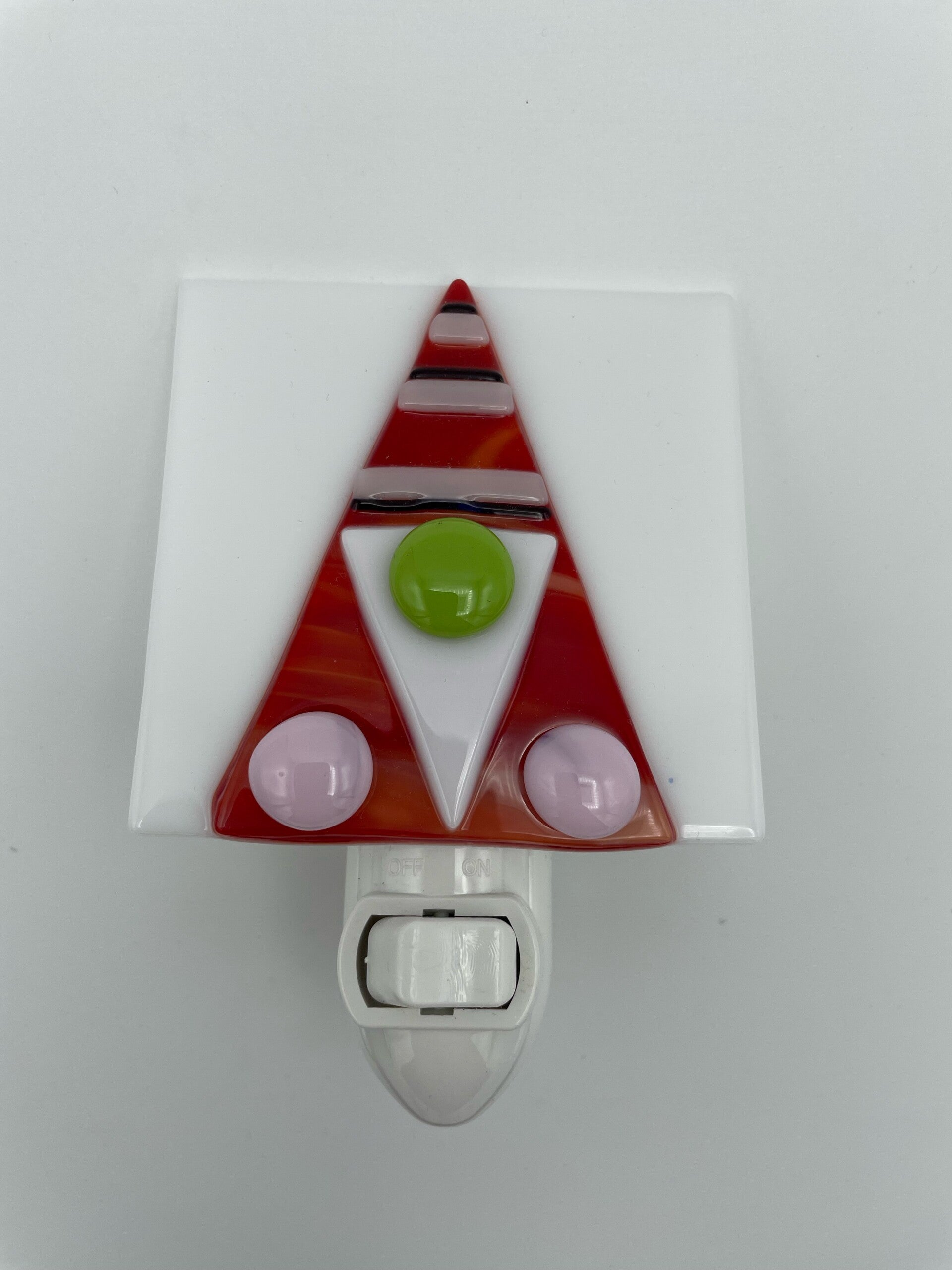 The glass design is hand cut, arranged on a 3”x3” piece of glass and then fused in my kiln for 12 hours to create this adorable night light. Colors may vary slightly from the picture due to the availability of glass at the time of creation.