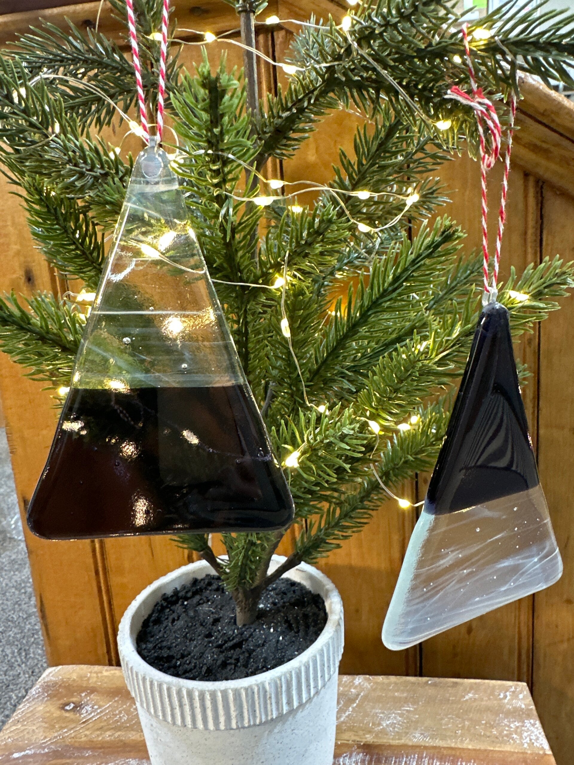 Let your tree lights shine through these Triangle Christmas trees made with either red and clear or purple and clear glass. Each ornament may differ as far as if the colored glass is on top or bottom with the clear.